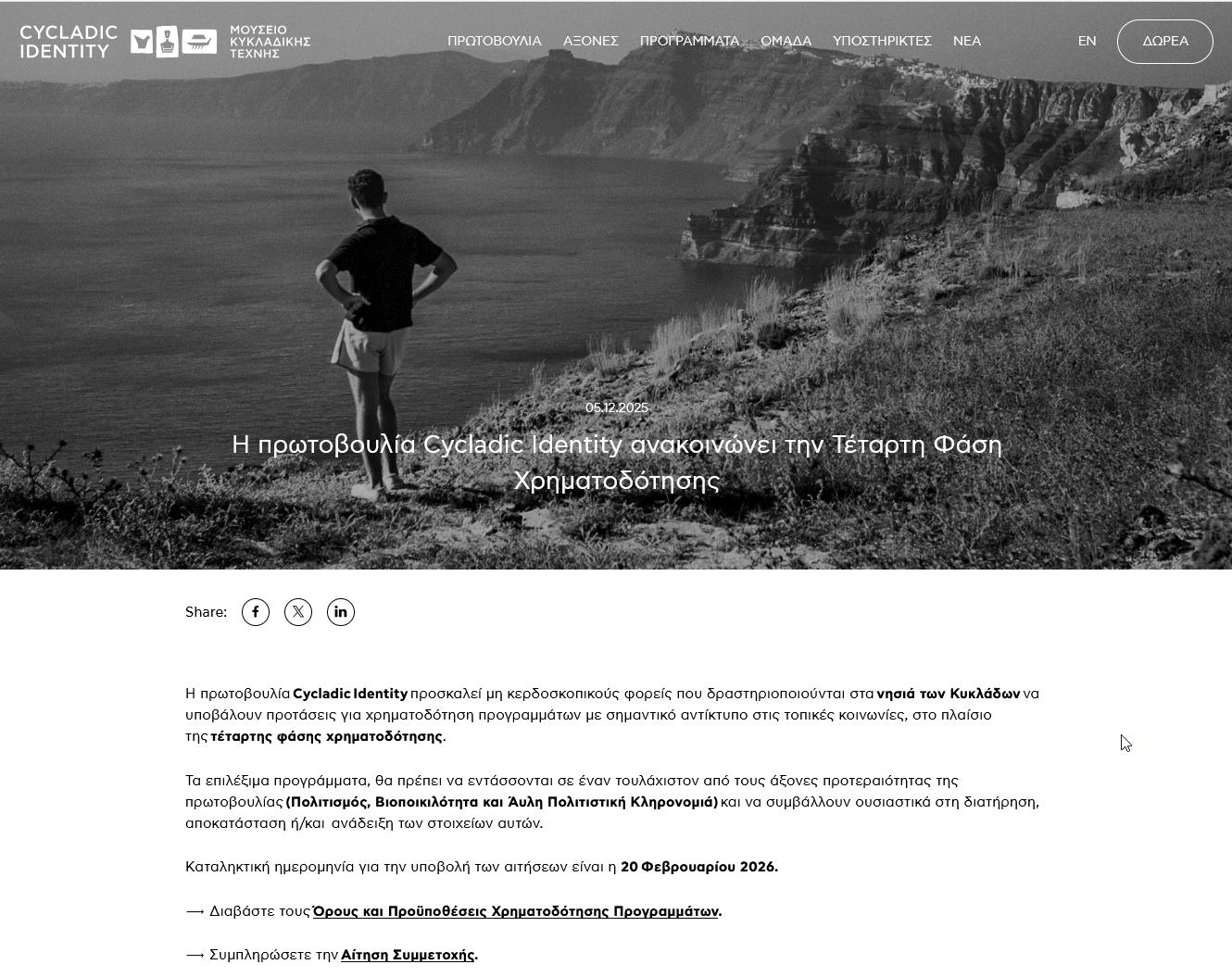 Η Πρωτοβουλία Cycladic Identity του Μουσείου Κυκλαδικής Τέχνης έχει ανακοινώσει την έναρξη της τέταρτης φάσης χρηματοδότησης προγραμμάτων που αφορούν τα νησιά των Κυκλάδων.