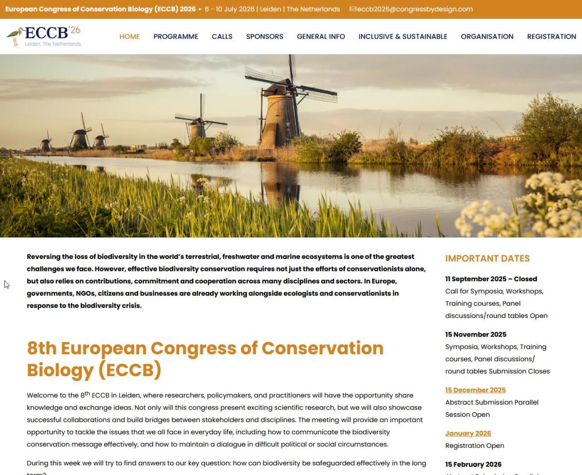 Submitted by hbsadmin on Thu, 08/01/2026 - 01:27 In the link below you can find information about the European Congress of Conservation Biology (ECCB), which will be held in July in Leiden. Abstract submission is now open, with a deadline of 15 February 2026. https://eccb26leiden.eu/ Tags Conferences